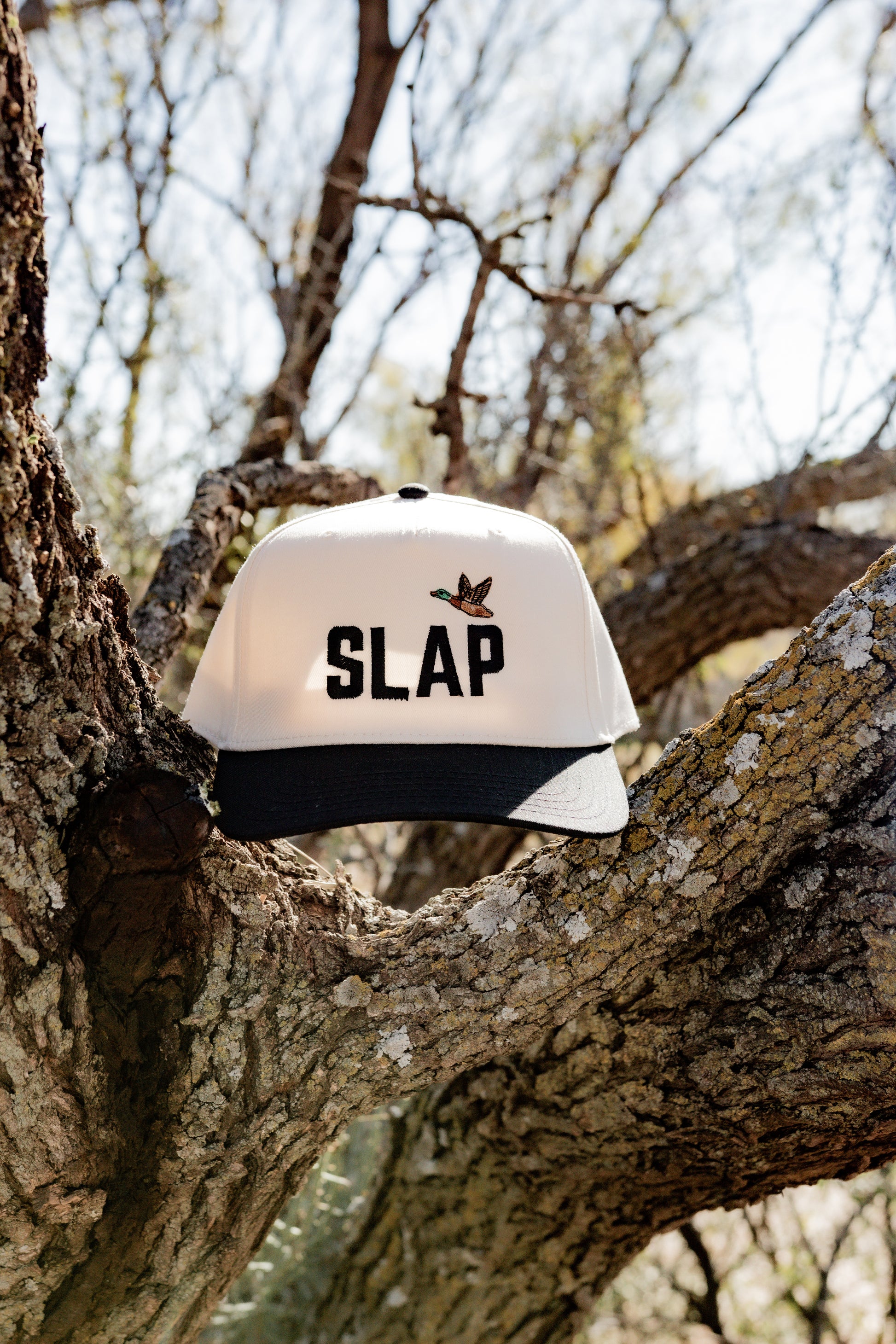 The Lady Slap Duck Edition is built for bold women who live for the outdoors. Featuring our signature “SLAP” embroidery and a beautifully stitched flying mallard, this trucker hat is the perfect combo of rugged style. The white front panel and black bill keep it clean, classic, and versatile for any adventure whether you're in the blind, on the trail, or just repping the lifestyle.