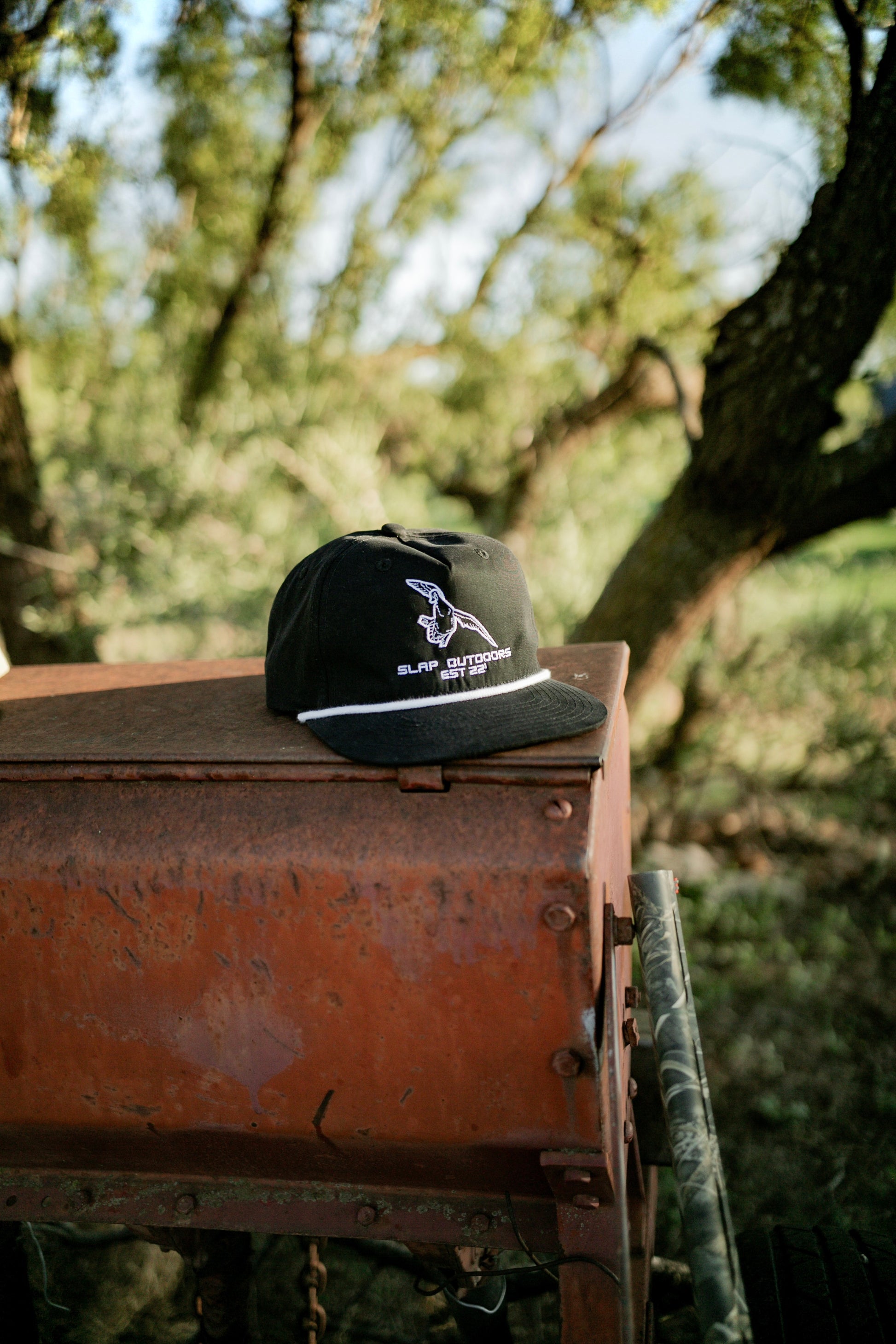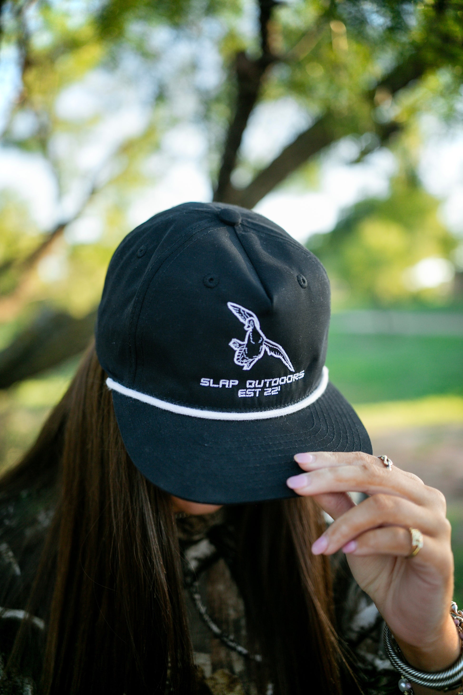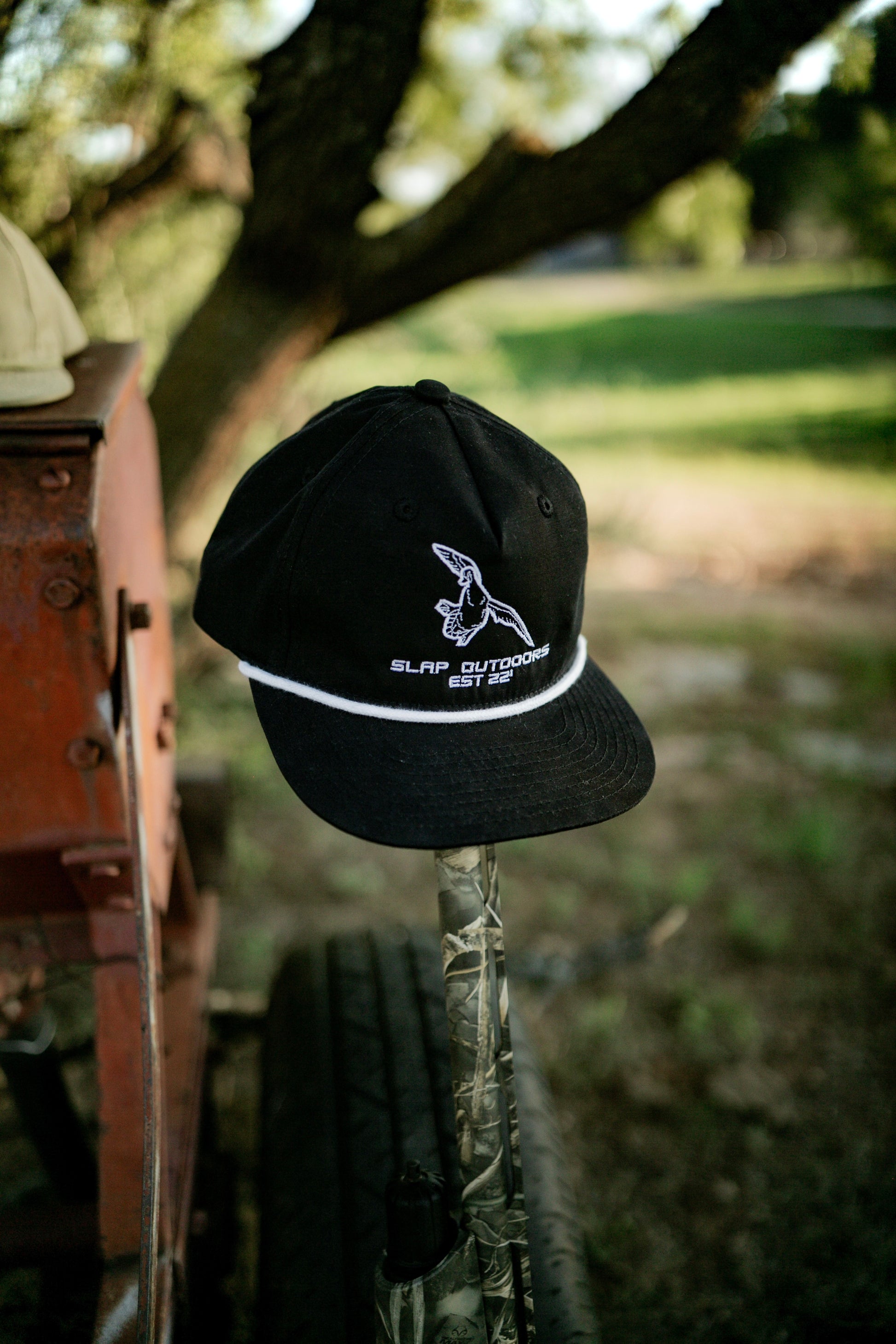 The one that started it all. The OG is our first-ever SLAP Outdoors hat a clean, classic black rope cap featuring an embroidered flying duck and our signature SLAP Outdoors EST. 22 mark. Designed for the field, the blind, and everywhere in between, this hat blends rugged tradition with everyday wearability. The white rope detail gives it that retro edge, and the snapback closure keeps it dialed in for any fit. If you know, you know. This is the original that built the brand.